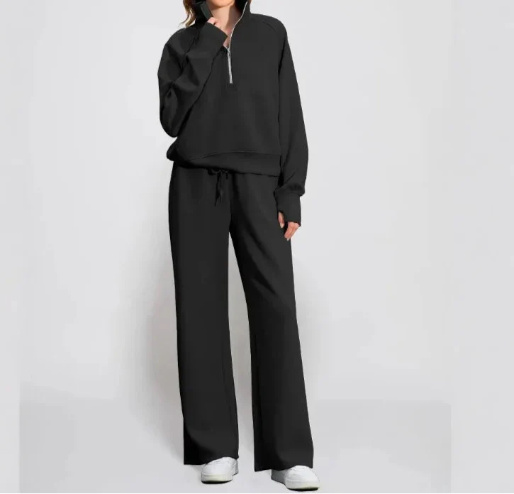 Discover the perfect blend of comfort and style with the Maya Luxe Lounge Set. Crafted from a soft yet structured fabric, this two-piece ensemble features a half-zip funnel neck top and relaxed wide-leg pants, providing a flattering silhouette without clinging. Ideal for leisurely mornings, casual outings, or cozy evenings at home, this set ensures you look polished while feeling completely at ease.